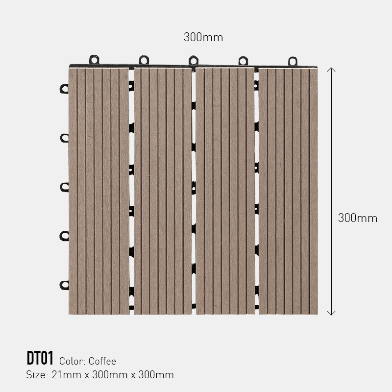 Vỉ gỗ nhựa lót sàn, thành phẩm theo từng tấm 300x300mm, dễ lắp ghép. Vỉ gỗ phù hợp lót những nơi ẩm ướt như sân vườn, sàn hồ bơi, phòng tắm, ban công… trang trí đẹp và chống trơn trượt