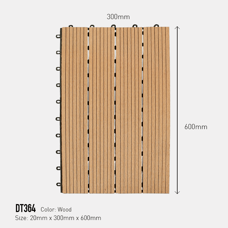Vỉ gỗ nhựa lót sàn, thành phẩm theo từng tấm 600x300mm, dễ lắp ghép. Vỉ gỗ phù hợp lót những nơi ẩm ướt như sân vườn, sàn hồ bơi, phòng tắm, ban công… trang trí đẹp và chống trơn trượt